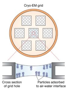 Schematic of a cryo-EM grid. Squares represent a collection of holes, and each hole has several particles embedded within vitreous ice. Cross-section view of a single hole demonstrates behavior of particles exhibiting “preferred orientation”.